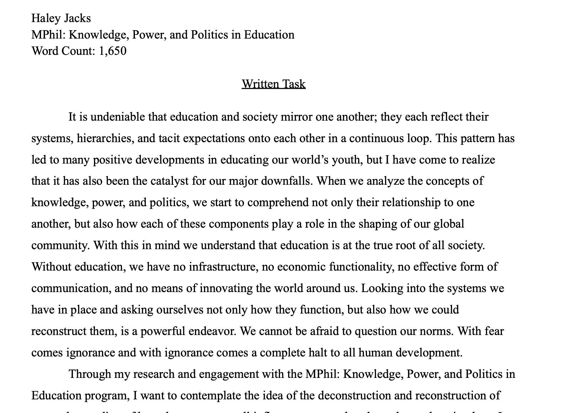 This piece was written in response to a structured research prompt requiring a 1,500–2,000-word analytical essay on knowledge, power, and politics in education. The assignment called for original research framing, critical engagement with theory and empirical literature, reflexive analysis of researcher positionally, and connections between education policy debates and real-world global challenges. This sample demonstrates my ability to synthesize scholarship, respond precisely to a complex brief, and articulate policy-relevant arguments with clarity and depth.